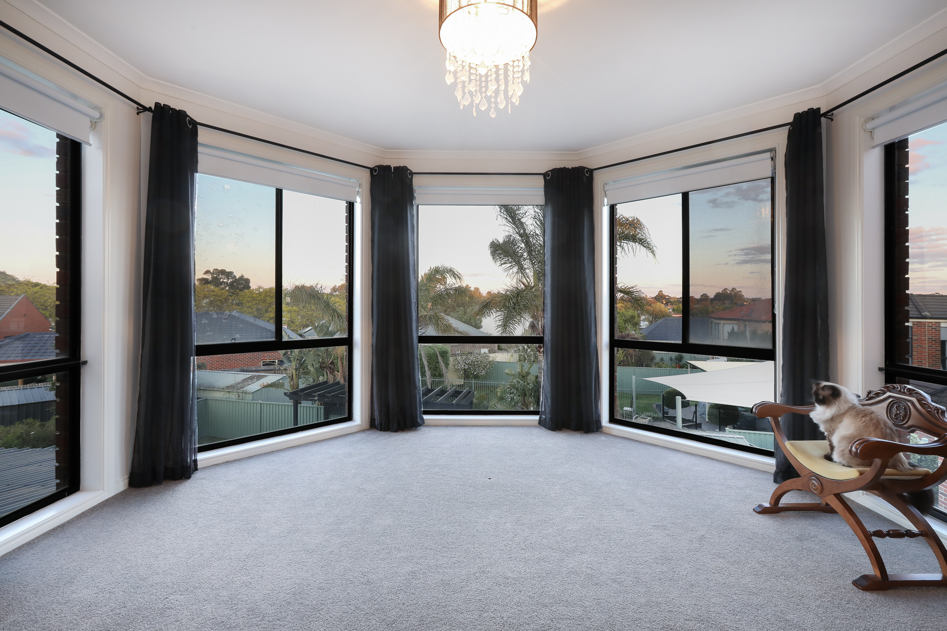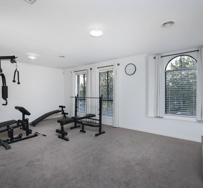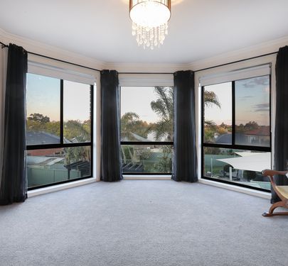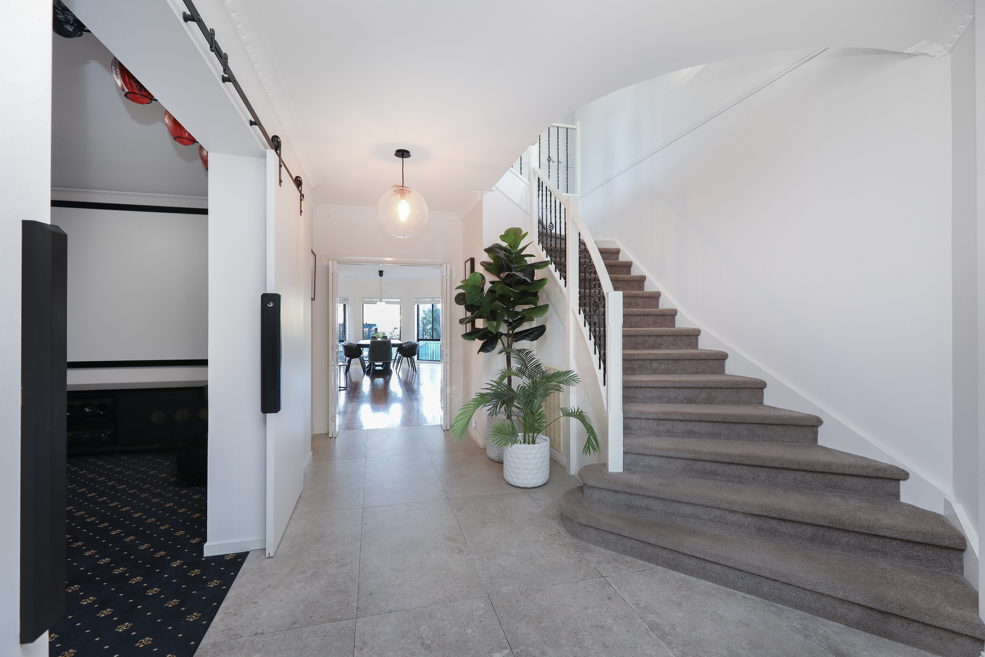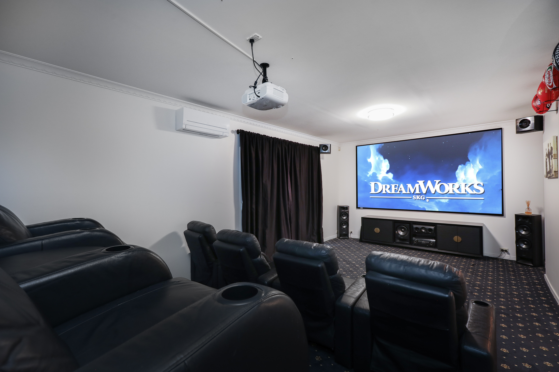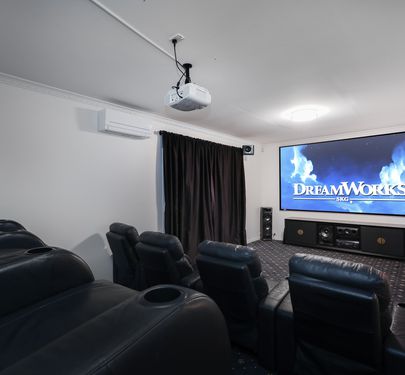 Upstairs, the master suite awaits with its walk-in robe, luxurious stone-topped ensuite, and unbeatable vistas, flanked by three double bedrooms with built-ins and a spacious multipurpose rumpus for the kids. Downstairs, a versatile study doubles as a fifth bedroom, while the fully renovated main bathroom and separate powder room keep things seamless. Relax in the converted theatre room featuring a 130" projector screen, 8-speaker surround sound, and six leather recliners for blockbuster movies or sports nights. With 9ft ceilings amplifying the airy feel, ducted heating, split system cooling throughout, in-house vacuum maid, full alarm, and surveillance cameras, every detail whispers security and ease.